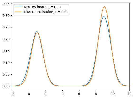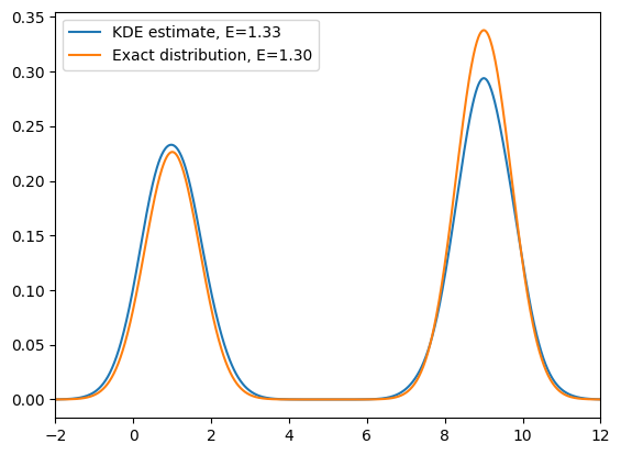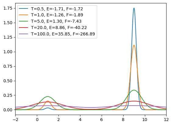 This looks promising: if we run a simulation at a higher temperature and then reweight, we can in principle recover the original distribution. However, this works neatly only for the 1D toy model. Why?